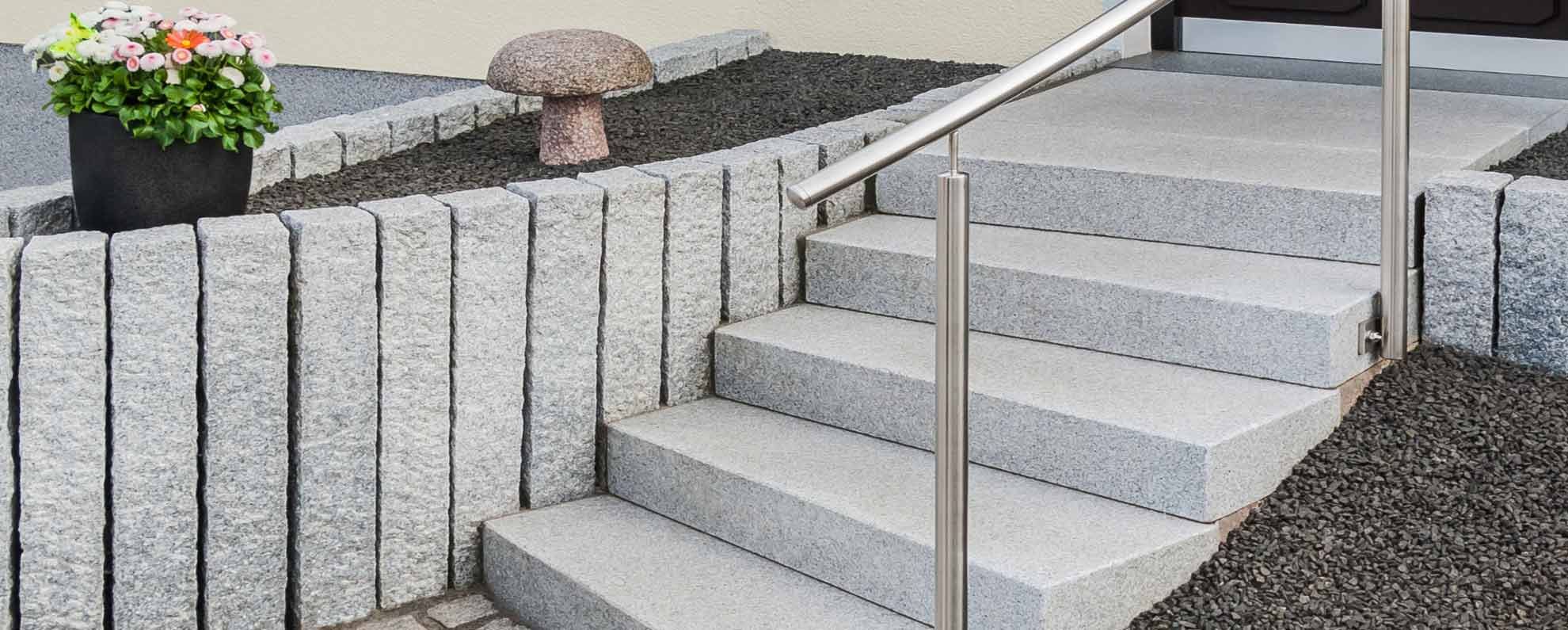 Dodáváme jak masivní žulové schody vhodné do extrémně namáhaných exterierů, tak i žulové a mramorové obklady schodů jak na venkovní, tak i vnitřní použití. Obklady se vyrábí ze dvou segmentů, a to podstupnice (svislá plocha) a nástupnice (vodorovná plocha). V rámci schodu nejsou žádné styčné spáry, kudy by mohlo zatékat pod obklad. Vyrábíme jak pravoúhlé formáty , tak šablonové kusy pro točitá schodiště. Do interieru používáme leštěné, broušené a kartáčované povrchy. Na venkovní použití potom volíme povrchy nesmekavé a to opalované. Umíme vyfrézovat nesmekavé pásky.